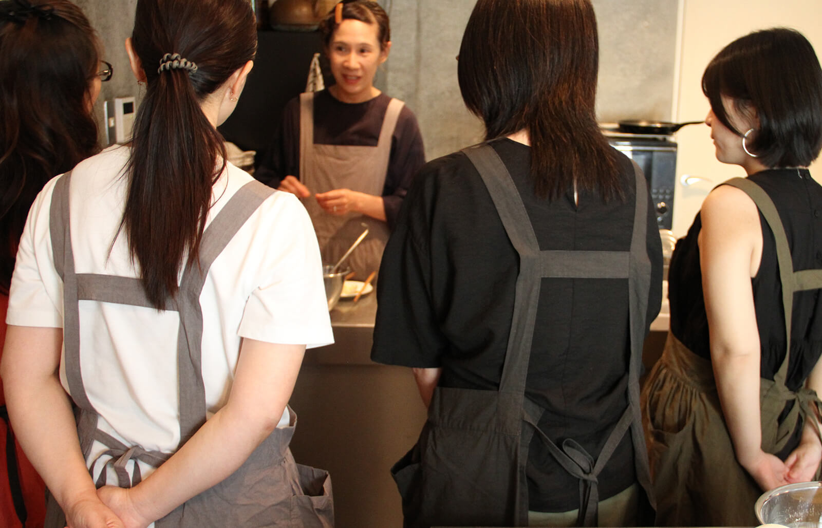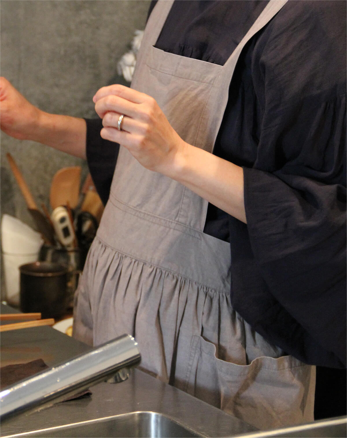 教室で愛用しているのは、SUNNY LOCATION のピナフォアエプロン。女性らしいシルエットでありながら甘さを抑え、素材の風合いをいかした佇まいが空間に自然に溶け込みます。佐藤さんだけでなく生徒の皆さんにも好評で、心地よさと動きやすさの両方を叶えてくれるエプロンです。