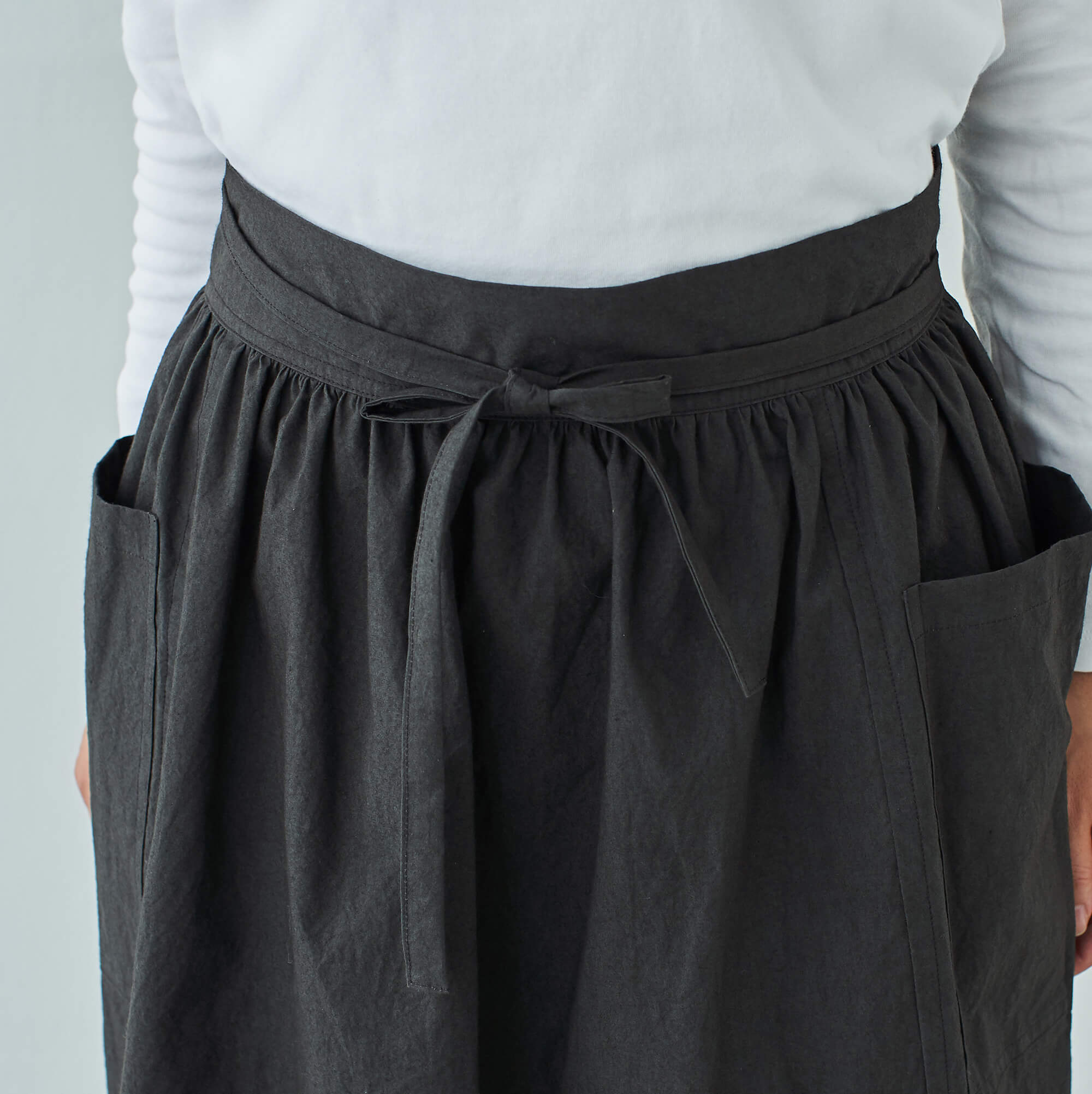 センターにギャザーを入れることにより「ふんわり」と柔らかなシルエットになります。左右に大き目のポケットが付きます。エプロンとしてはもちろん、巻きスカートとしてもお使いいただけます。